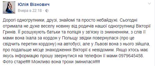“Дорогі одногрупники, друзі, знайомі та просто небайдужі. Сьогодні отримала не дуже веселу новину від родичів нашої одногрупниці Вікторії Гринів. ЇЇ розшукують батьки та поліція у зв’язківку із зникненням, зі слів її мами вона їхала за кордон у Польщу звідки повернулася (про це свідчить перетин кордону) на автобусі, але у Львові вона з нього зійшла, проте подальше місце знаходження Вікторії є невідомим.